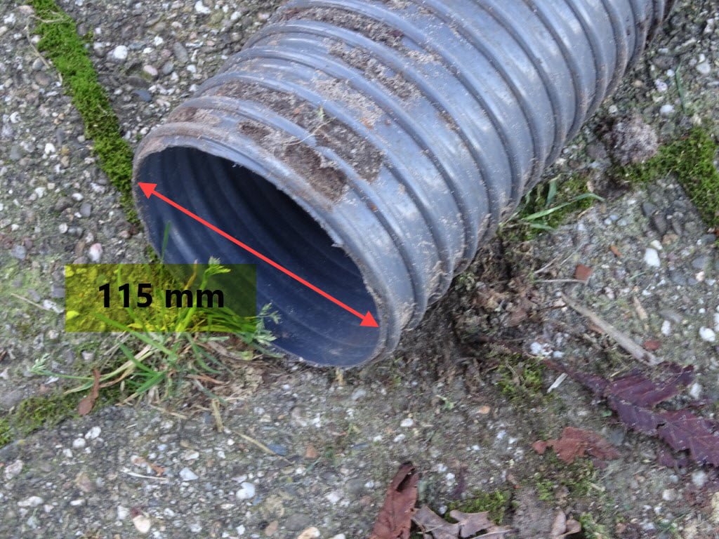 En de slang die aangesloten wordt is 4 meter lang en heeft een van uitw.diam. 115 mm.